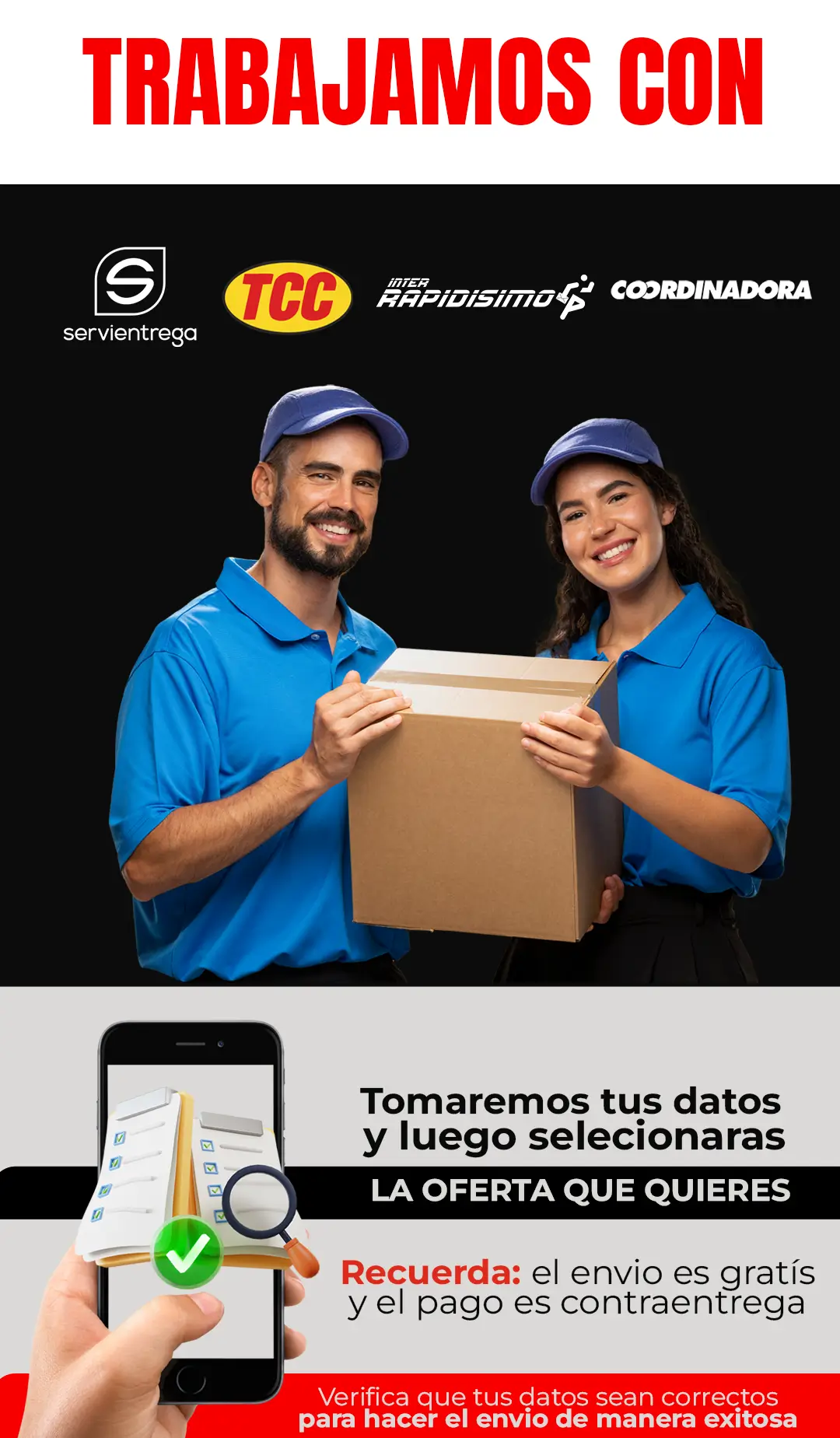 Los envíos se realizan por Envía, Coordinadora o Interrapidísimo, y llegan en 2-7 hábiles según tu ciudad. Además, puedes pagar al recibir sin ningún riesgo.